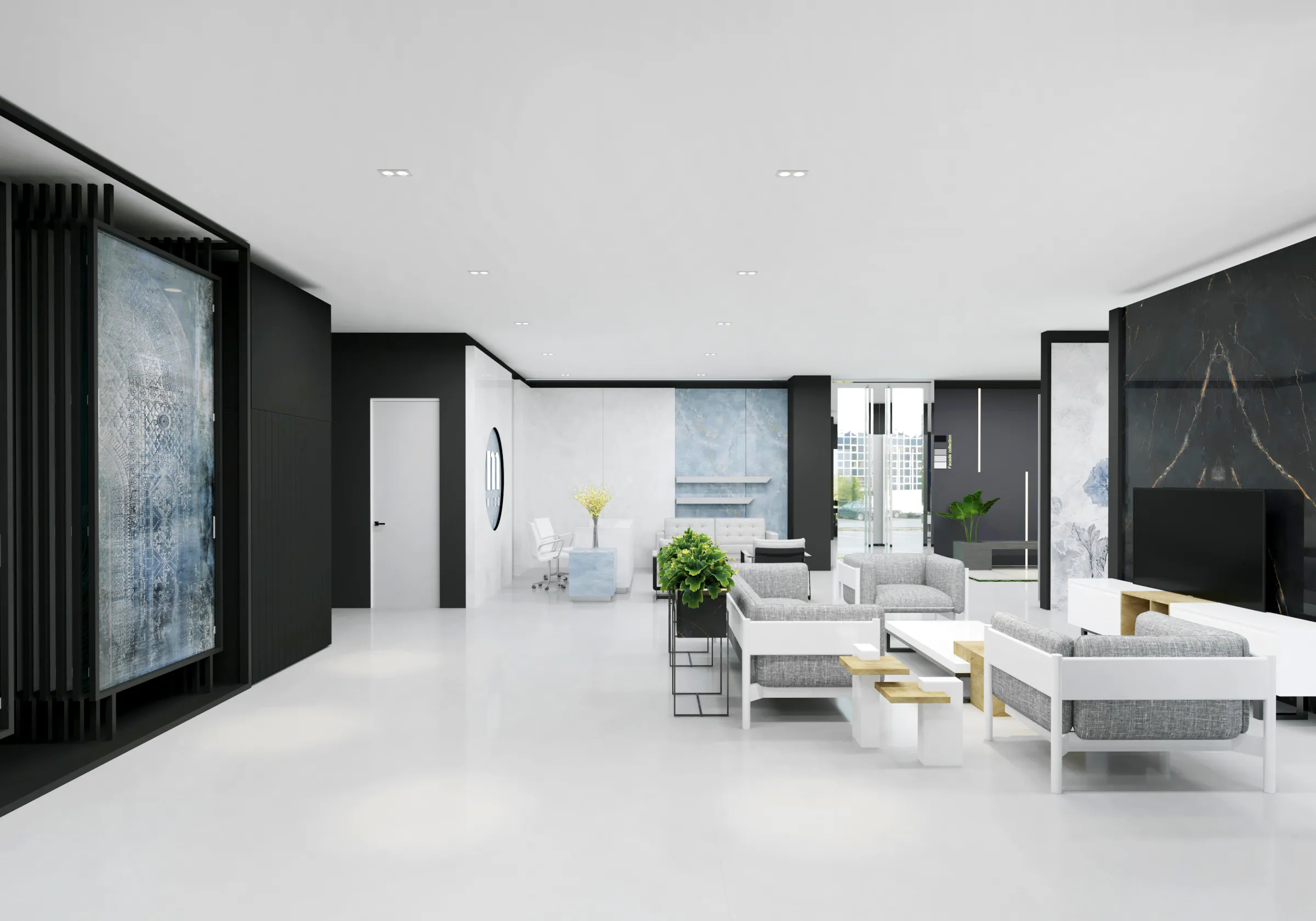 Supply and installation of ceramic tiles for the common areas and double-layer UV protection glass for the windows